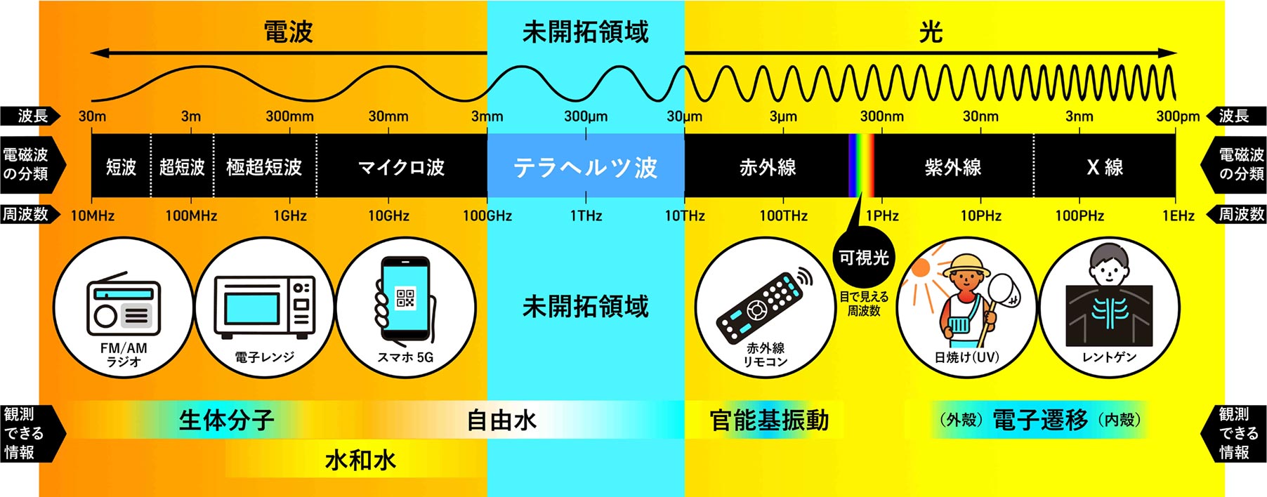 白神電磁波の一種です。電磁波の種類は「波」の特徴を表す「波長」で定義され、波長が長い「電波」から「マイクロ波」「テラヘルツ波」「赤外線」「可視光」「紫外線」「X線」へと波長が短くなっていきます。我々が見ている「可視光」というのは実は非常に狭い範囲で、電波はラジオやテレビに、マイクロ波は電子レンジや最近は5G、6Gの通信に、赤外線はサーモグラフィーや光ファイバー、X線はレントゲンにとさまざまなところに使われていますが、「テラヘルツ波」という領域はこれまでほとんど使われてきませんでした。
