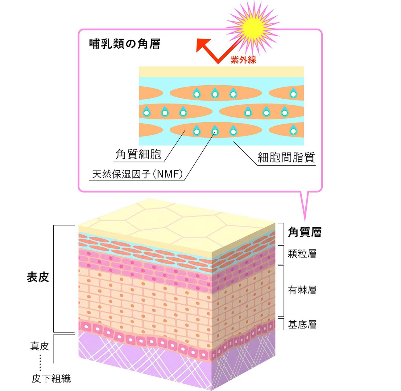 白神ええ。皮膚というのは大きく分けると、外から「表皮」「真皮」「皮下組織」というふうに分類され、「表皮」の中にはさらに4つの層がありますよね。一番深いところの「基底層」で細胞分裂が起きて、「有棘層」で分化し、「顆粒層」で細胞死を経て、最終的に「角層」という死んだ細胞が集まってできたバリアが形成されるわけです。その厚みは20μm(マイクロメートル)程度、おおよそラップ1〜2枚分ぐらいと非常に薄いけれど、哺乳類の場合はこの角層の中に角層細胞がたくさん積み重なっていて、角層細胞中には天然保湿因子(Natural Moisturizing Factor/以下、NMF)と呼ばれる水を抱えるような物質があります。そして、その角層細胞の周りには「細胞間脂質」という脂が隙間を埋めていて、いわばレンガとセメントのような構造を作ってバリアを形成しているというのが一般的に考えられている構造ですよね。ただ、実際にどこに水が存在し、どのような役割を果たしているのかはわかっていないわけです。