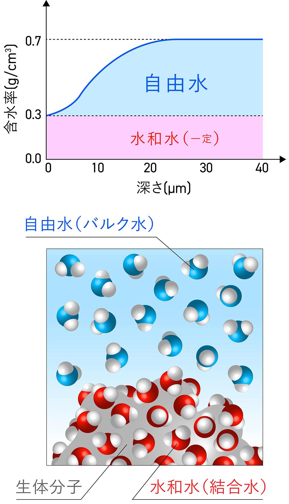 「水和水」はタンパク質などに束縛されている水で、「自由水」は自由に動ける状態の水分子ですよね、その違いが重要だと
