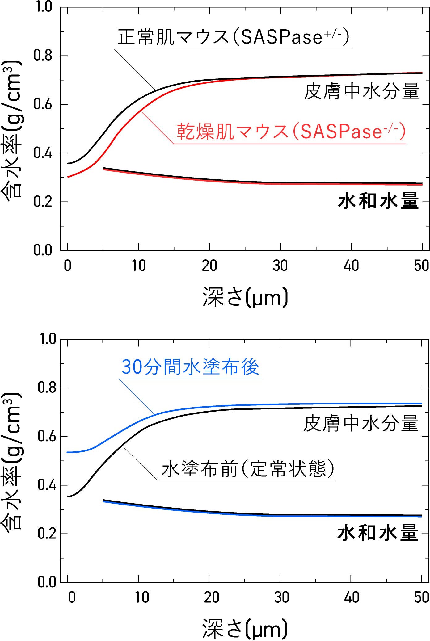 白神そうなりますよね。ちなみに、マウスの皮膚に30分間水を塗ったときと塗らなかったときの水和水の量も同じでした。実際に水を塗ったあとの角層表面はふやけるような感じになり水を多く含むのにもかかわらず、皮膚に水を塗布しても乾燥させても水和水の量は一定量に維持されていた。つまり、肌が乾燥して水分が減る際、減っているのは主に「自由水」であり、生命維持に不可欠な「水和水」は一定量に保たれていることが、テラヘルツ分光によって初めて明らかになったのです。