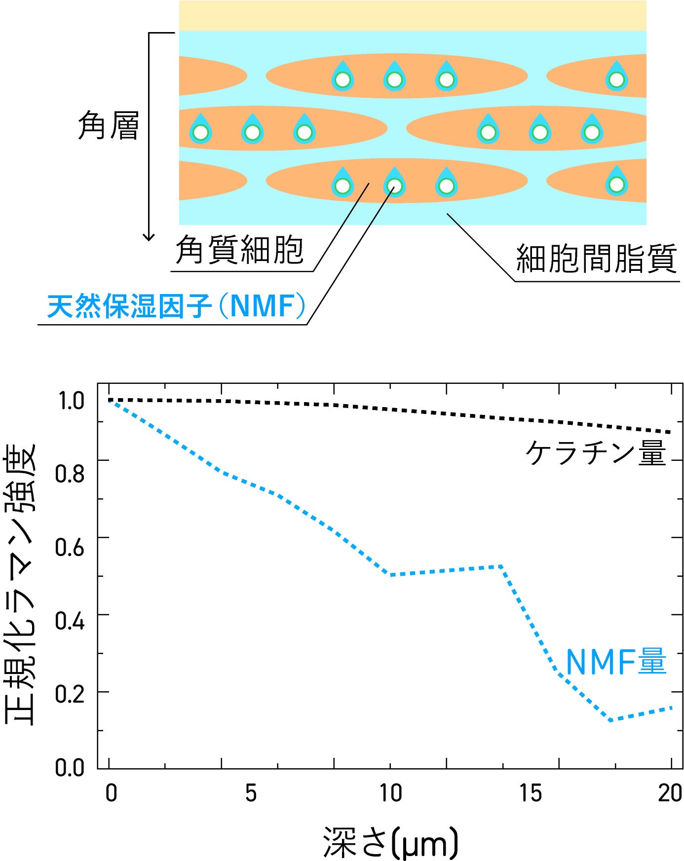 白神そこが実に興味深い点で、このとき同時にマウスの天然保湿因子(NMF)の量を共焦点ラマン分光器で計測したのですが、NMFの量は皮膚の深さとともに減少していました。つまり、NMFの量が減っても水和水の量が変わらなかったということから、水和水はNMFによって抱えられていない可能性が見えてきた。では、何が水和水を抱えているのか。このグラフの中にあるように、ケラチンの量は角層の中でもほぼ均一に分布しているので、たぶんケラチンが主要因になっているのではないと思っているところです。